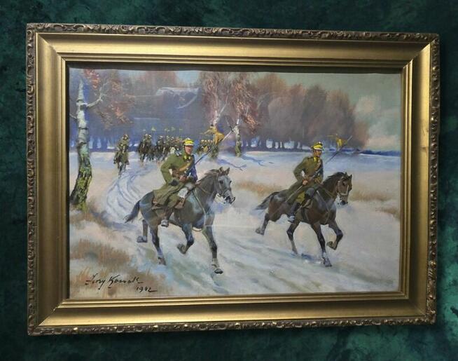 Obraz "Przejazd ułanów” oryginalny, certyfikowany obraz autorstwa Jerzego Kossaka. Technika: Olej na tekturze, rok ...